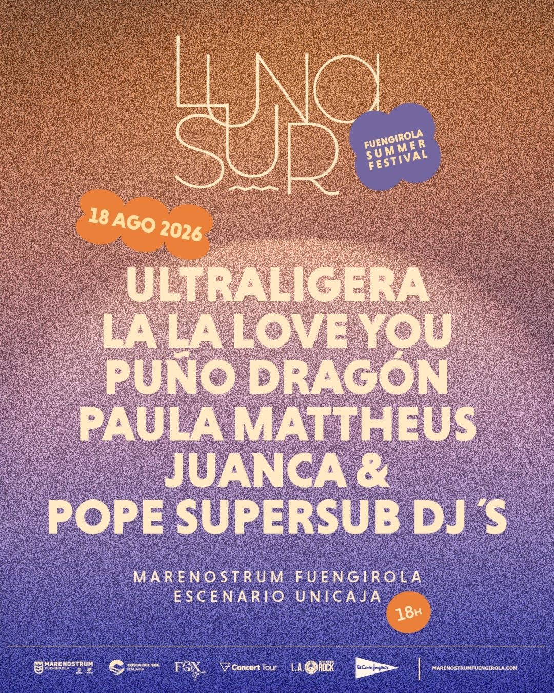 El festival de música indie Luna Sur vuelve con su edición tardeo anunciando como primeros artistas confirmados a Ultraligera y Juanca y Pope Supersub djs. En cada edición, la marca ha buscado entretejer la música con el espacio de Marenostrum Fuengirola. El próximo 18 de agosto de 2026 las puertas del recinto fuengiroleño abrirán a las 18:00 horas y terminará a las 00:00 horas, sellando la tarde perfecta para un martes de verano.